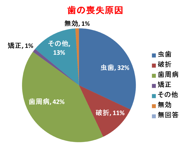 歯の病気というと虫歯を連想する方が多いと思いますが、実は歯周病が原因で歯がなくなるほうが多いという統計があります(グラフ参照 引用元:永久歯の抜歯原因調査報告書 東京: 8020推進財団; 2005.)。若いうちは虫歯でなくなる割合が多いのですが、40代後半以降では、歯周病で歯がなくなる割合が高くなっていき、全体としては歯周病により、42%の歯がなくなっています。