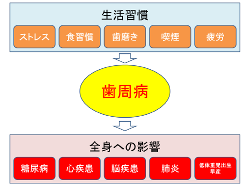 例えば、右の図のように、歯周病はたくさんの生活習慣、全身健康に関係していることが明らかになっています。